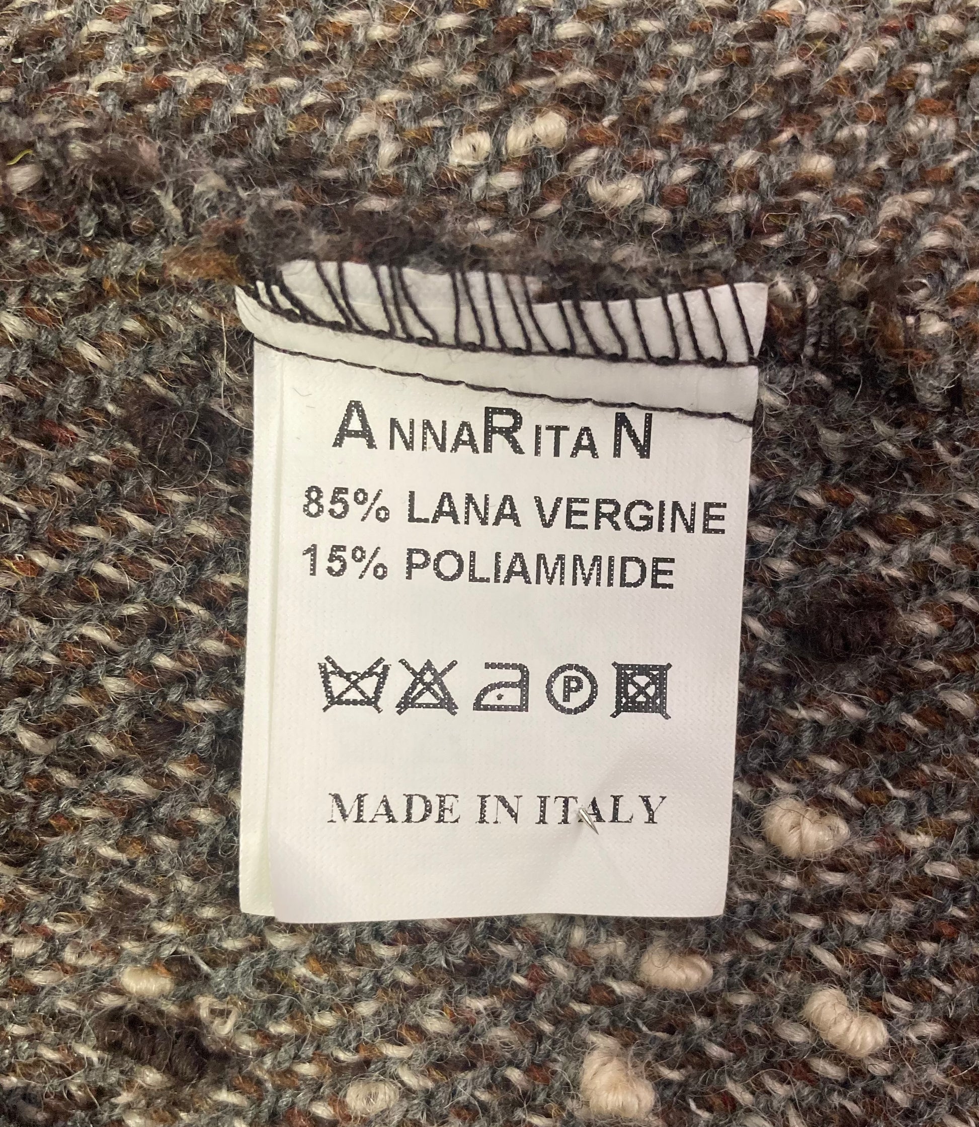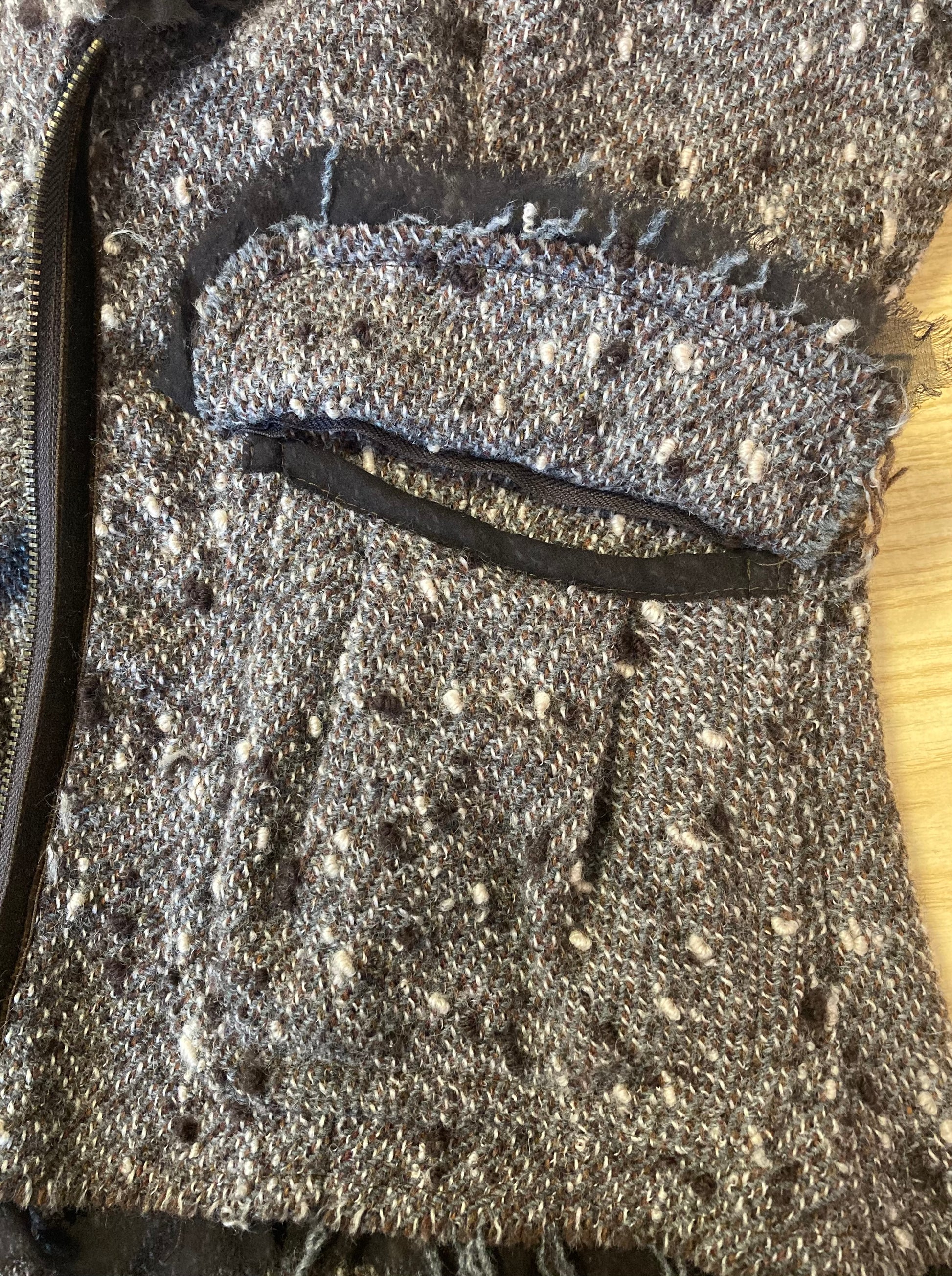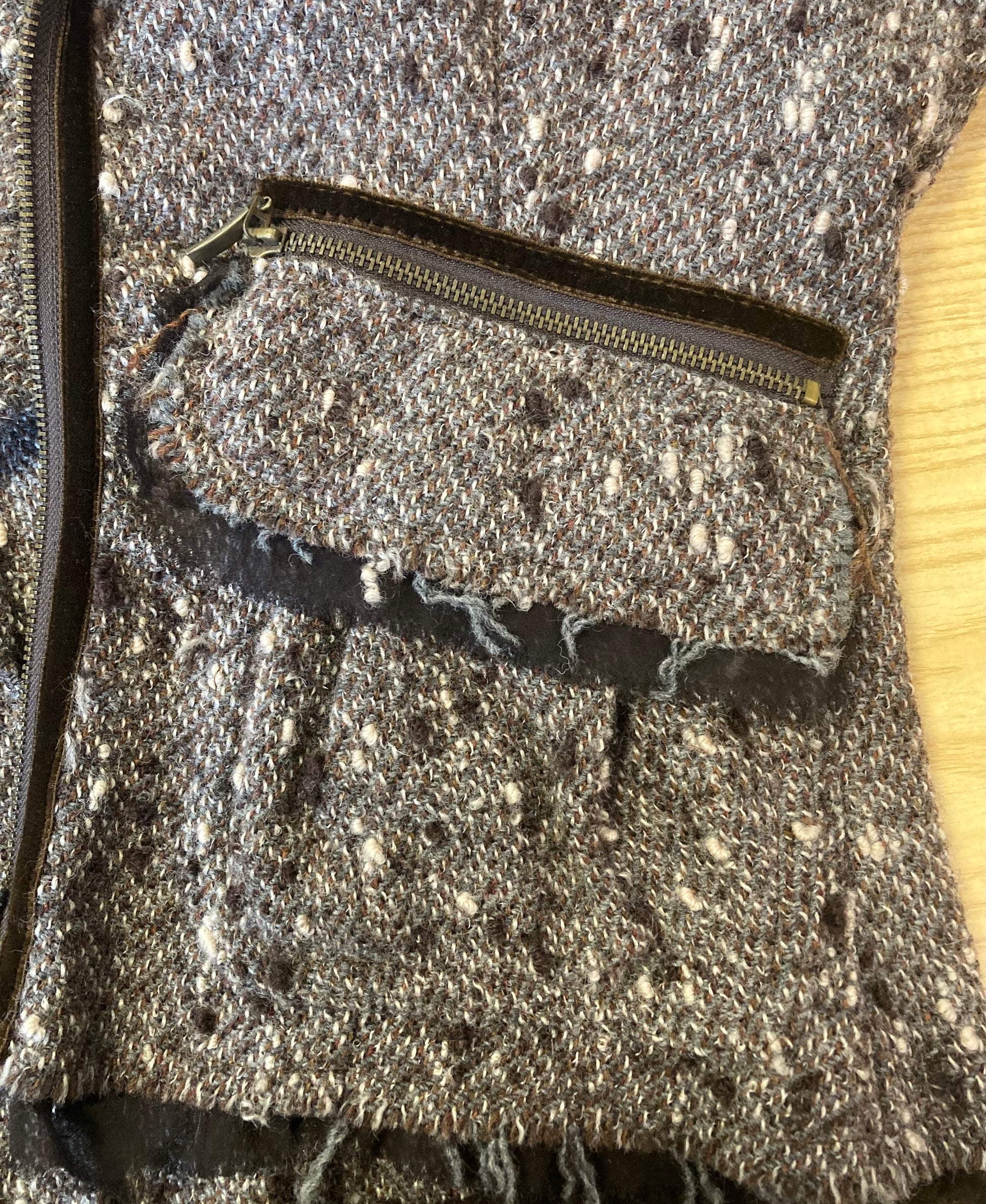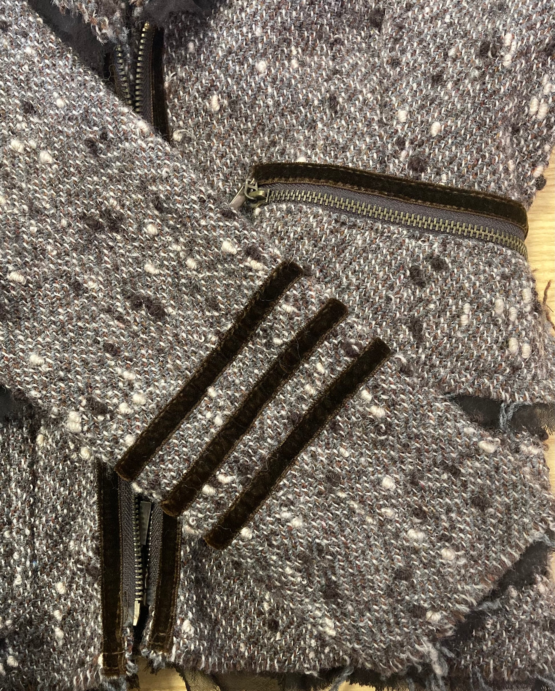 Blazer vintage in lana marrone con inserti in velluto. Apertura con cerniera metallica, vestibilità aderente